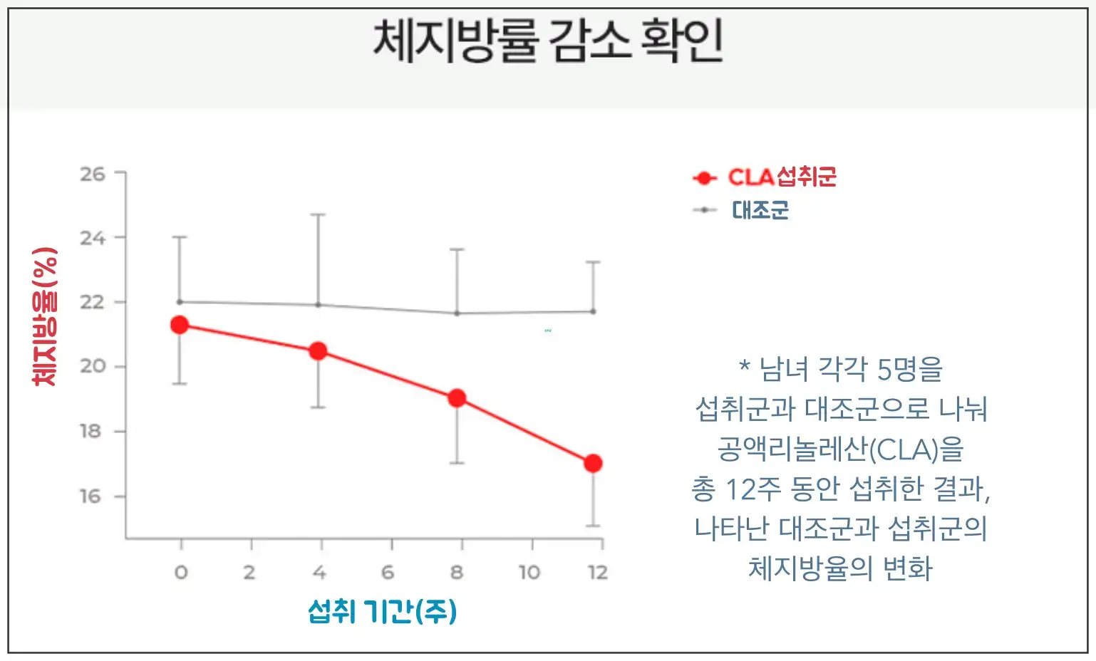 실제로 남자 5명, 여자 5명을 대조군과 섭취군으로 나눠 하루 1600mg씩 총 12주 동안 섭취했더니, 체중 감소와 체지방율이 유의미하게 감소되었다고 하는데요. 아래의 그래프는 체지방율 감소 효과를 나타낸 것입니다.