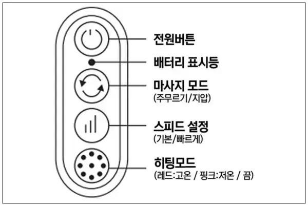 - 온열 마사지 기능: 사람에게 편안한 온도감인 40℃~45℃ 2단계 온열기능이 있어, 개인에 맞는 온도로 근육속 깊숙이 온열감을 주어 경직된 근육을 시원하게 풀어줄수 있습니다.