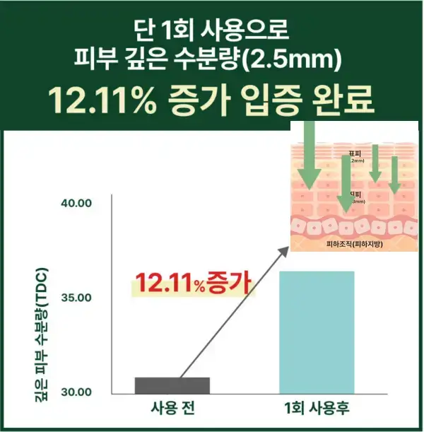 20명을 대상으로 휴먼에틱에 한 임상시험 결과에 따르면, 수분 증가율은 단 1회 사용만으로도 제품 사용전에 비해 12.11% 증가한 것으로 나타났고요.(물론, 2.5mm깊이로 이런 결과 나타남)