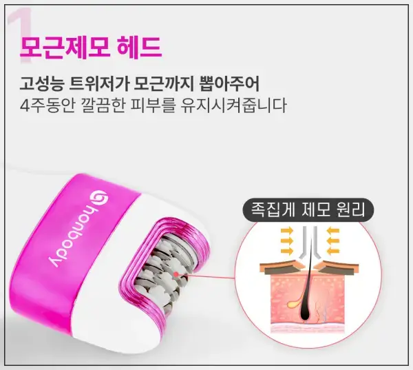좀더 구체적으로 말해서, 왁싱처럼 깔끔하게 할수 있는 것운 모근제모헤드, 트리머헤드, 각질제거헤드 3가지 헤드를 사용하기 때문에 가능하다는데요. 아래에서 각각의 기능에 대해 살펴볼게요.