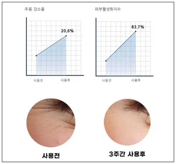 실제로 만 15세~60세를 대상으로 3주 동안 이 크림을 사용해본 결과 주름 감소율은 사용전에 비해 20.6%개선되었고, 피부 활성화 지수도 사용전에 비해 83.7% 개선된 것으로 나타났습니다.