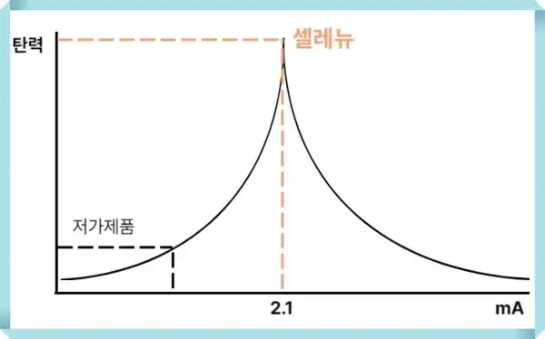 저주파를 이용한 탄력기기가 많은데, 저주파 자극만으로는 탄력이 생기지 않으며, 탄력에 맞는 저주파가 따로 있다고 하는데요. 셀레뉴는 수많은 연구끝에 오직 얼굴탄력에 최적화된 2.1mA출력을 개발했고, 셀레뉴에는 2.1mA출력의 저주파가 탑재되었다고 합니다.