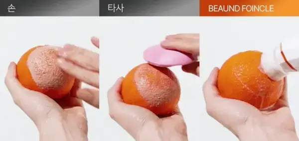 포인클의 효과는 한 마디로, 세정이 섬세하고 꼼꼼하게 잘 된다는 건데요. 피부속 사이사이에 끼어있는 메이크업 잔여물, 먼지, 이물질이 모두 빠져 나올수 있도록 깔끔하게 클렌징할수 있다고 합니다. 그 효과는 아래와 같이 사람 피부와 흡사하다는 귤 위에 화장품을 발라 놓은후 3가지(손, 타사, 포인클)의 클렌징 효과를 비교해 봤는데요. 아래 사진에서 육안으로 비교해 볼수 있습니다.