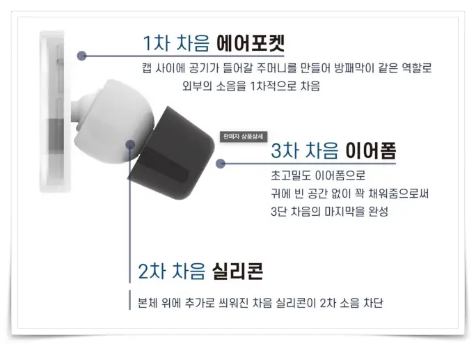 - 1차: 에어포켓, 2차: 차음 실리콘, 3차: 이어폼