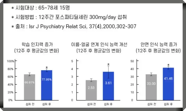 실제로, 65세~78세 15명을 대상으로 매일 포스타티딜세린 300mg씩 12주동안 섭취하게 한 결과, 학습 인지력은 섭취 전 66.91%에서 섭취 후 77.95%로 향상되었고, 이름-얼굴 연계 인식 능력은 섭취전 2.53에서 섭취후 3.61로 향상, 안면인식 능력은 섭취전 33에서 섭취 후 41.46으로 향상되었다고 합니다.