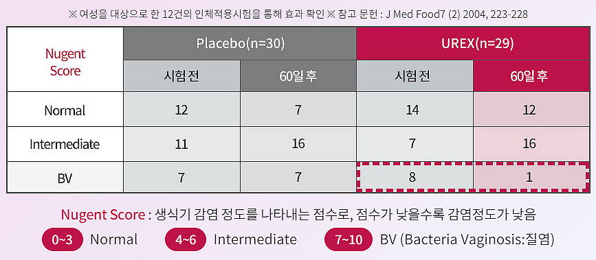 - 질염 정도를 나타내는 Nugent Score(생식기 감염 지수)가 감소됨을 확인