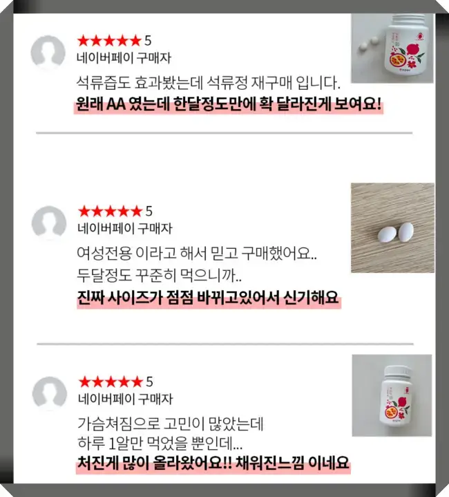 이상과 같이, 건강비서 석류정에 대한 후기는 주로 긍정적이었지만, 일부 사람들은 한 달을 먹은 후에도 효과를 느끼지 못하는 경우가 있습니다. 이 제품은 일반 의약품처럼 쉽게 효과가 나타나는 것이 아니며, 개인의 신체 상태나 반응에 따라 차이가 있을 수 있습니다. 따라서 각자에게 맞는 영양제를 찾아가는 것이 중요합니다.