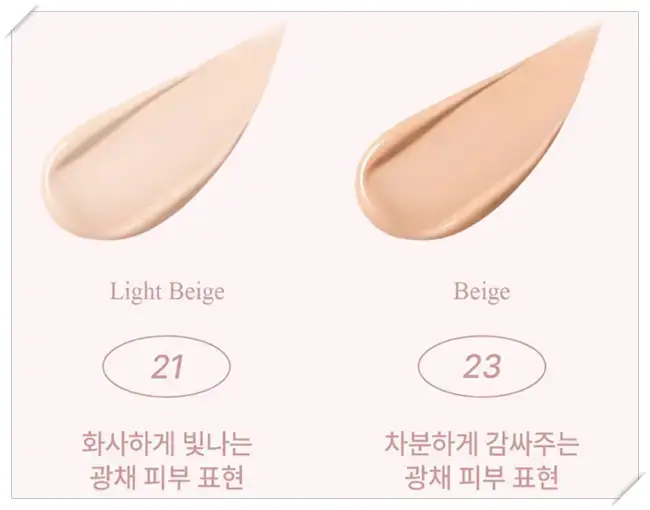 피부 표현 좋음: 커버력이 쏘쏘지만 광택 나고 피부 표현이 좋음.