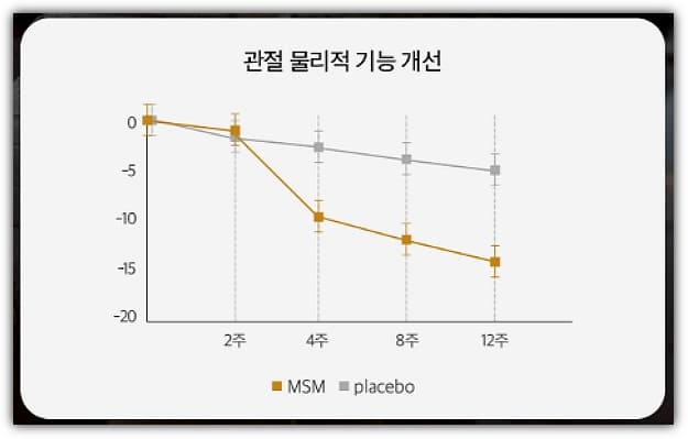 MSM섭취 후 4주부터 섭취군은 비섭취군에 비해 관절의 물리적 기능이 개선되기 시작해서 8주, 12주를 섭취하면서 섭취를 안했을 때와 비교해 상당한 차이를 나타내는 것을 알수 있습니다.