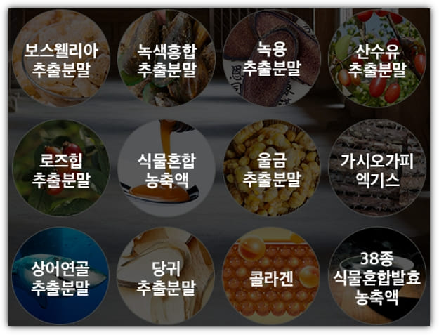 청관춘에는 이 외에도 역시 관절에 좋다고 알려진 보스웰리아추출분말, 상어연골추출분말, 로즈힙추출분말을 비롯해 총 53가지의 부원료를 꼼꼼하게 선별해 추가했는데요. 이들 성분은 대부분 관절, 뼈, 그리고 연골 건강에 도움이 되는 원료로 가득채워져 있어 청관춘에 시너지를 강화할 것으로 보입니다.(아래 부원료 성분 참조)
