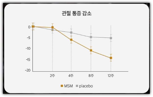 40세~70세의 무릎관절이 불편한 성인남녀 40명에게 매일 MSM 6g씩 12주 동안 섭취하게 한 결과, 위 이미지와 같이 대조군에 비해 섭취군의 관절통증이 섭취 후 4주 후부터 개선되기 시작해서 8주, 12주동안 섭취하면 현저한 차이로 관절통증이 감소하는 것으로 나타났음을 알수 있었습니다.